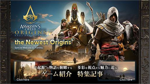- ファミ通.comにて、“起源”の物語の“最新”情報をお届けする本ゲームの特設サイト「-the Newest Origins-」がオープンしました。『アサシン クリード オリジンズ』がますます楽しくなる、さまざまな読み物コンテンツを公開予定ですので、ぜひチェックしてください。 詳しくはこちら >
